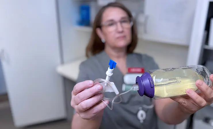 One of the patients who has received intravenous antibiotic treatment at home is Linda Brönnheim. She carried the antibiotic pump with her at all times in a small bag, allowing her to move around freely at home. The pump contains a balloon reservoir that delivers the antibiotic into the bloodstream at a constant rate. The treatment is delivered using portable infusion pumps.