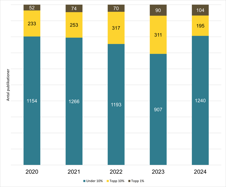 Andelen högciterade publikationer inom klinisk medicin Sus har ökat sedan 2019. Diagrammet avser publikationer som är publicerade i tidskrifter som tillhör ämnen som finns under paraplyet klinisk medicin (enligt Web of Science). Som framgår tillhör över 70 av årets publikationer inom Skånes universitetssjukhus gruppen ”topp en procent mest citerade publikationer i världen inom klinisk medicin”.
