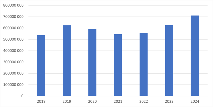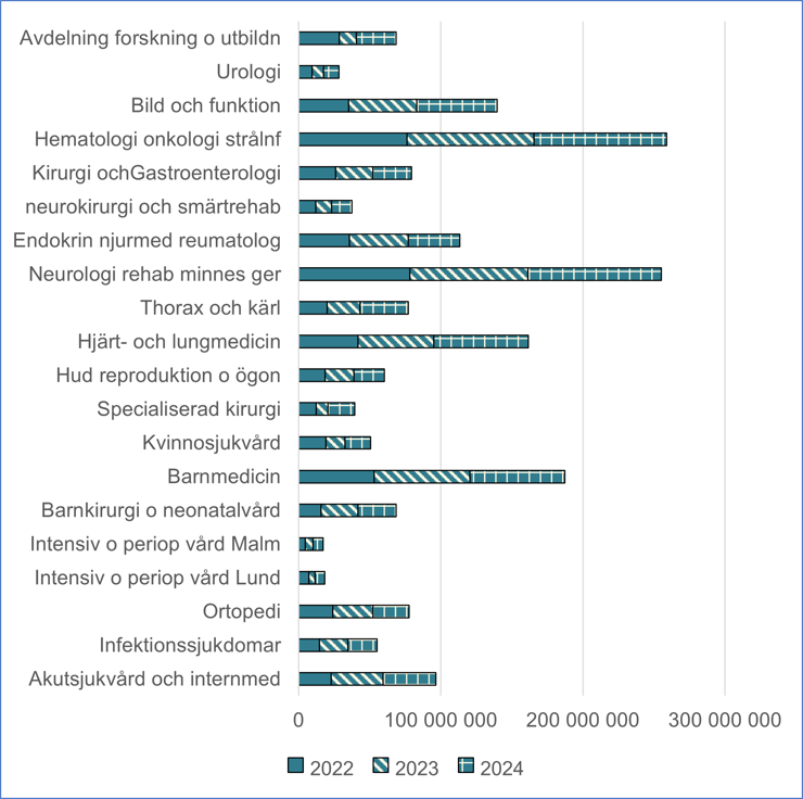 Datan i diagrammet utrycks i kronor. Mängden uttagna forskningsmedel varierar från verksamhetsområde och år. Under 2024 togs mest medel ut inom verksamhetsområdet för neurologi; verksamhetsområdet för hematologi, onkologi och strålningsfysik samt verksamhetsområdet för barnmedicin.